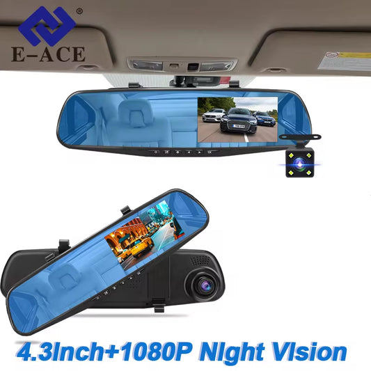 Dash Cam 4.3 Inches Car DVR Rearview Mirror Driving Recorder Dual Lens Front and Rear Camera Video Recorder Black Box